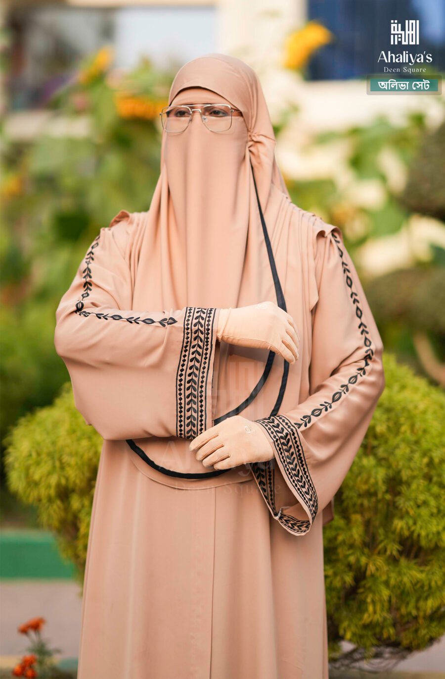 অলিভা আবায়াতে সাদাসিধে ডিজাইনে এবার এক বিশেষ এব্রোড্রি ডিজাইন যোগ করা হয়েছে যা সেটটিকে আরও ক্লাসি ও এলিগ্যান্ট করেছে।