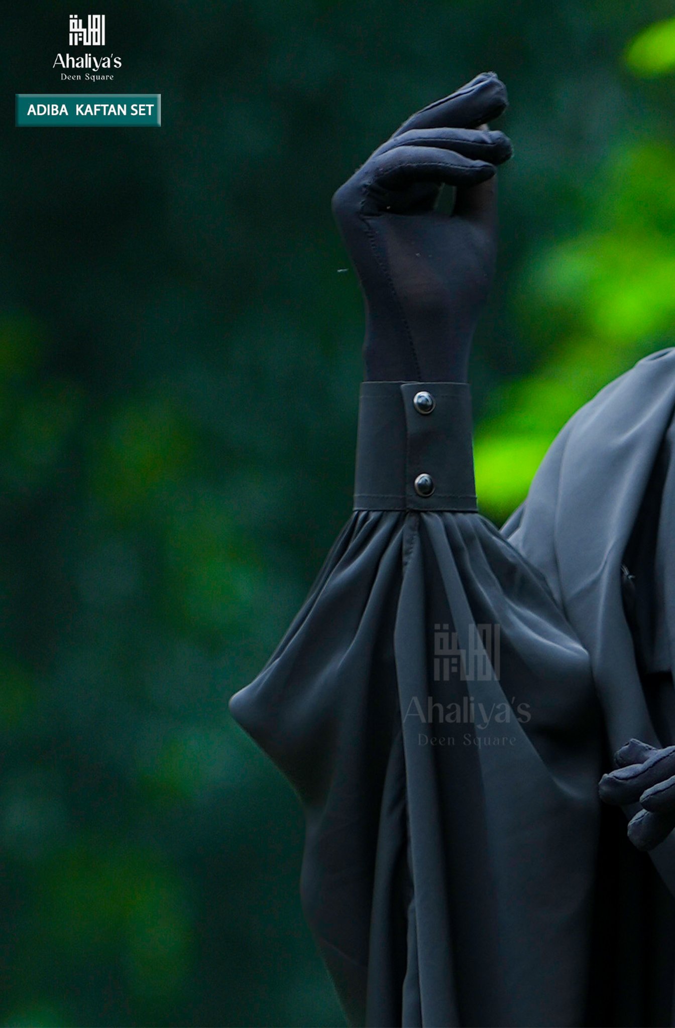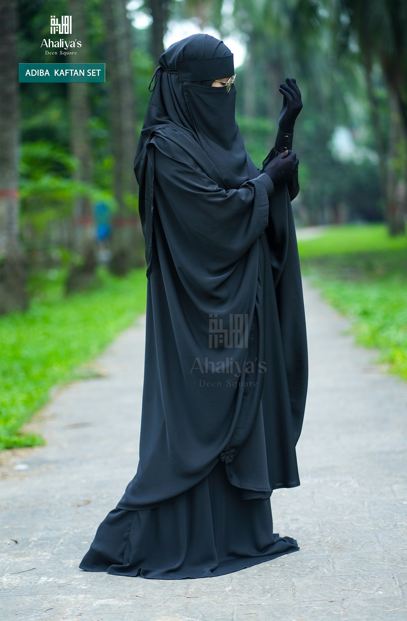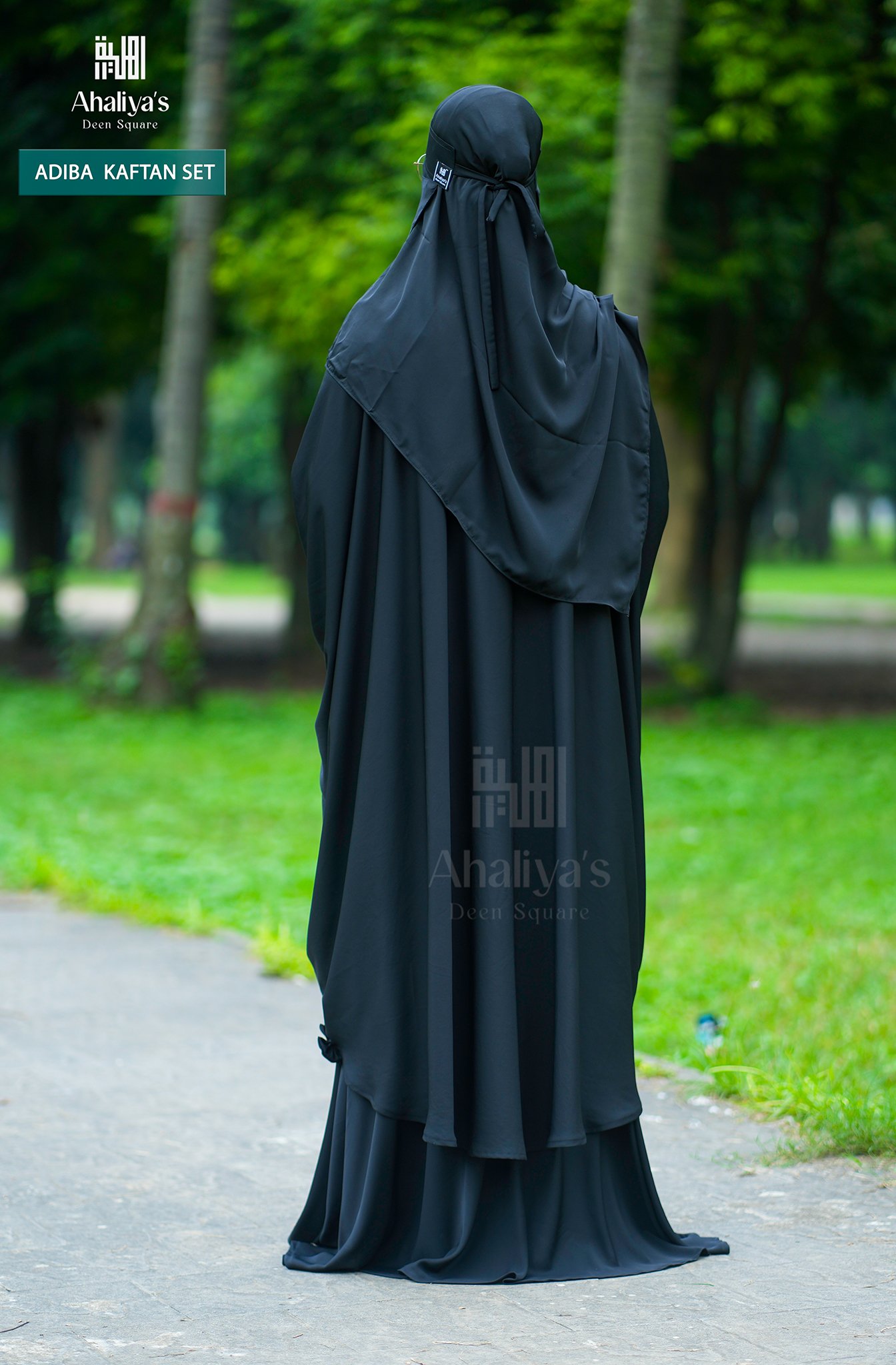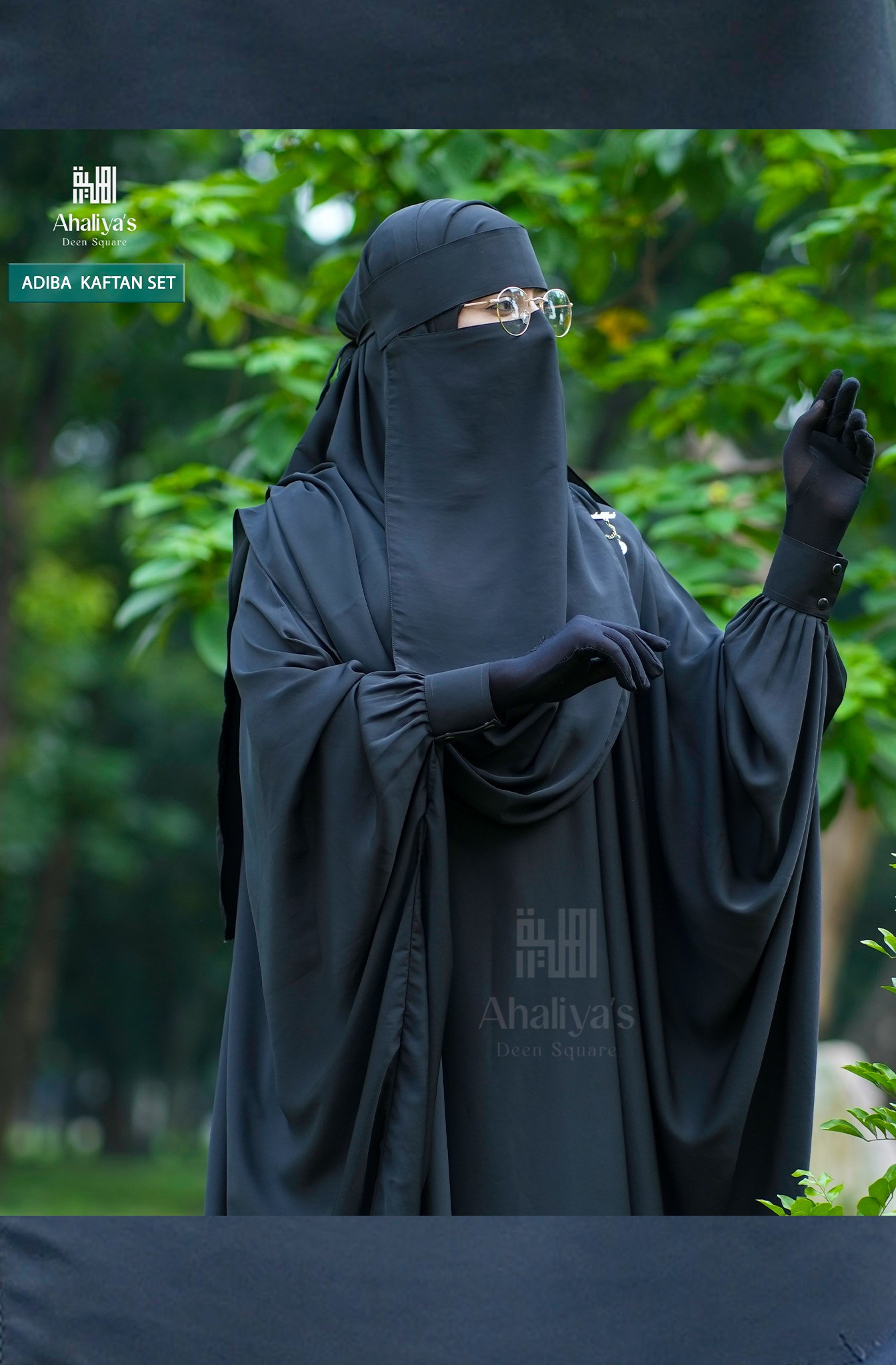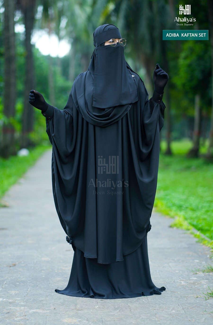 “আদিবা কাফতান সেট”, সেটের উপরের কাফতান পার্টটি খুবই সুন্দরভাবে কাভারেজ দেয়! যত মোটা কিংবা প্রেগন্যান্ট কেউ হোক না কেন উপরের পার্টটি আপনাকে পরিপূর্ণ ঢেকে রাখবে। বাতাসেও আপনার পর্দা নষ্ট হবেনা,কাপড়টি গায়ে লেগে যাবেনা। সেটটিতে যা যা থাকবে, (কাফতান+স্কার্ট+ওড়না হিজাব+বোল্ড নিকাব) কাফতানে থাকবে গোল গলা কাফ হাতা, কাফতানের দুইপাশে বো থাকবে ।