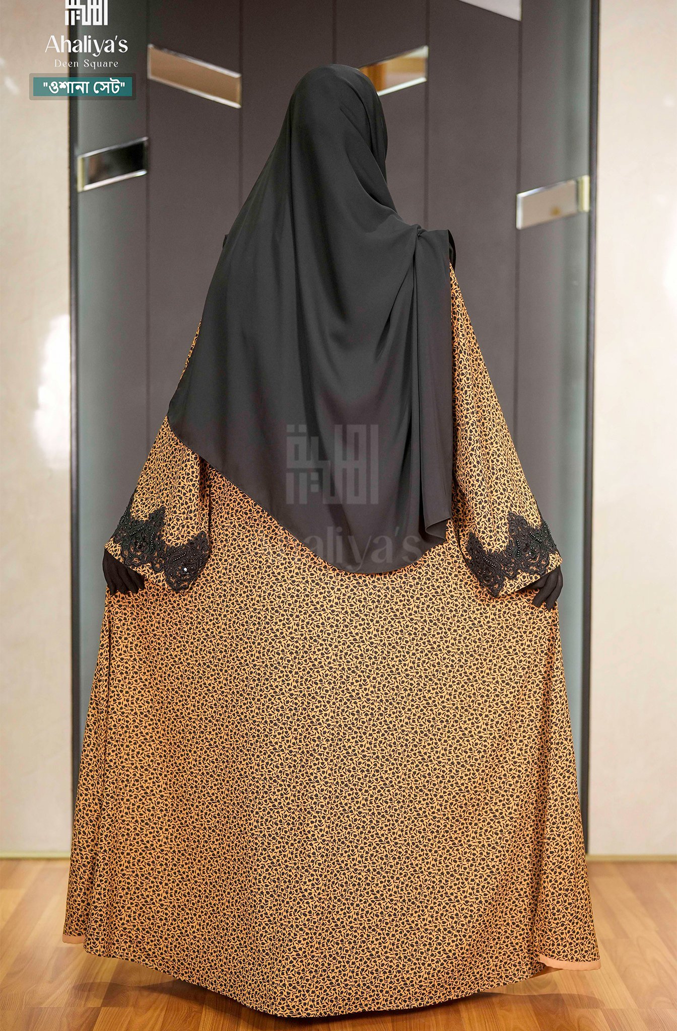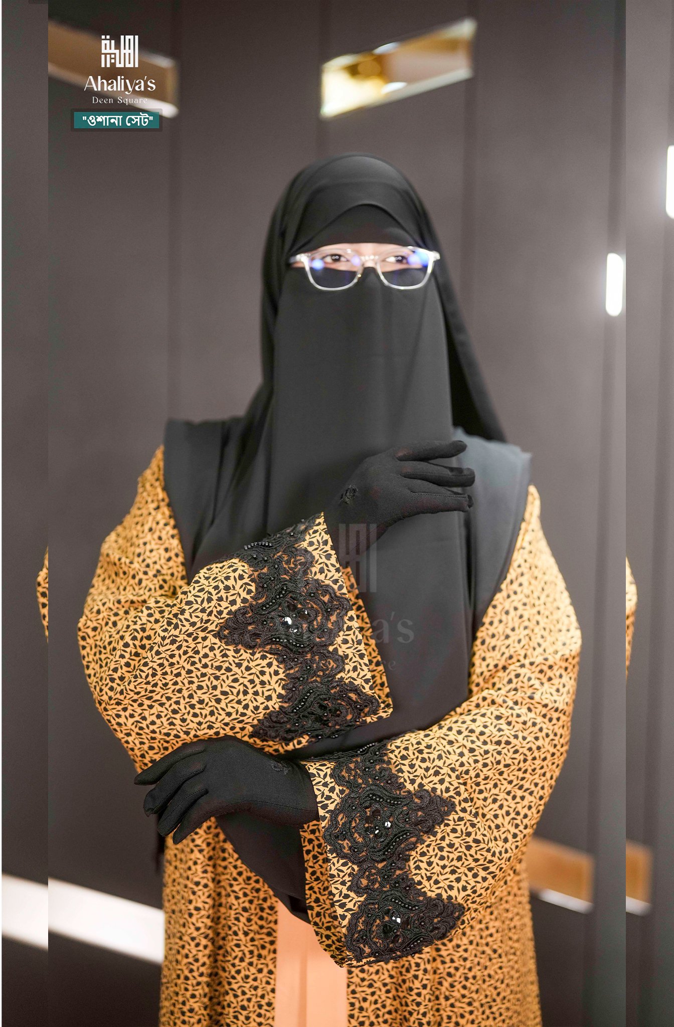 “ওশানা সেট”। মাস্টার্ড ইয়োলো কালারের এই ফ্লোরাল প্রিন্টেড সেট এর বোরকাটি হবে এটাচ কোটি সিস্টেম বোরকা, যার হাতায় থাকবে সুন্দর ব্ল্যাক কালারের লেইস। সাথে থাকবে প্লেইন ওড়না এবং ডাবল লেয়ার এক পার্ট নিকাব। যারা একটু কালারফুল বোরকা পছন্দ করেন, তাদের জন্যই আমাদের এই সেটটি। শলীনতা বজায় রেখে আপনি ঈদে অথবা অন্য যেকোনো বিশেষ অনুষ্ঠানে এই সেটটি পরে খুবই নিশ্চিন্তে চলতে পারবেন।