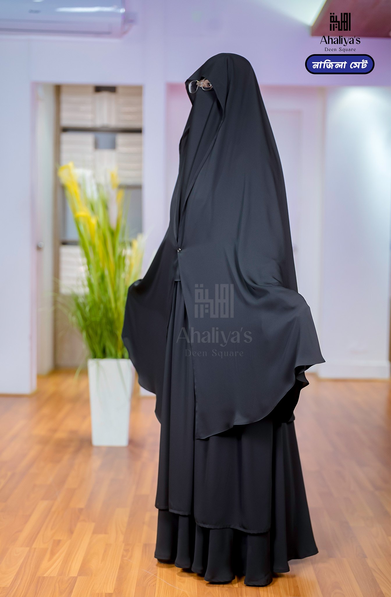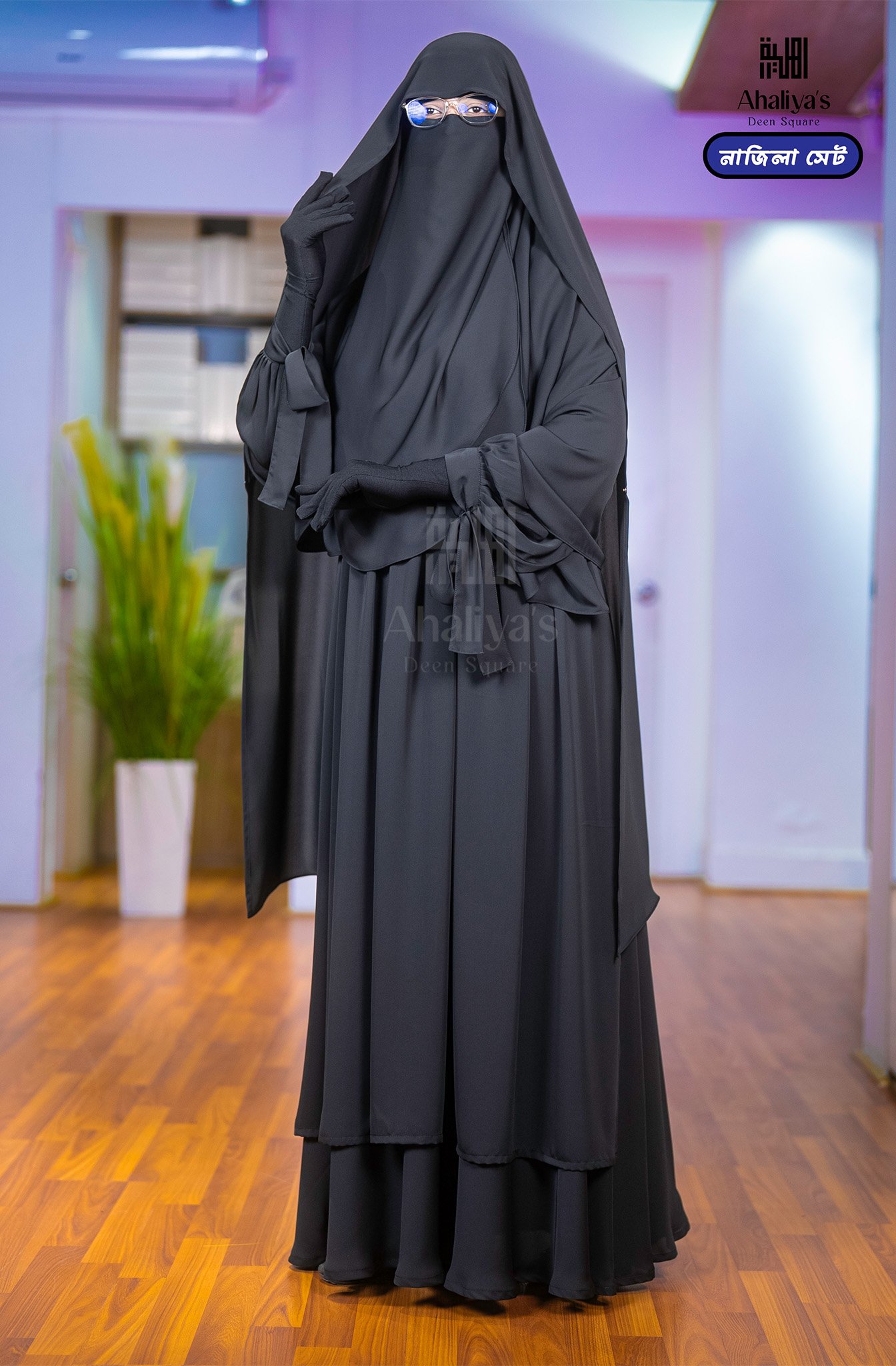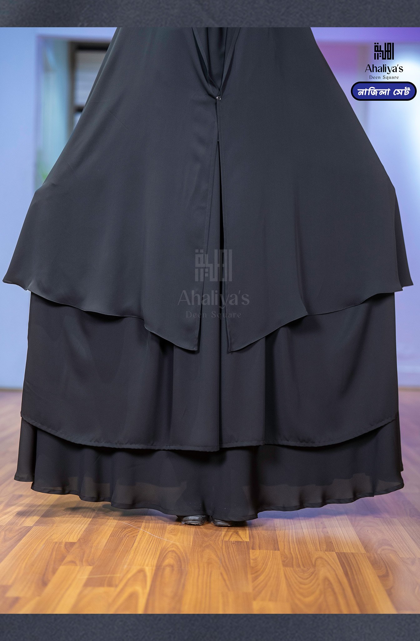 সামনে এক্সট্রা লেয়ার যুক্ত কোমরে কুঁচি করা বোরখা, হাতার ডিজাইনেও রয়েছে ফিতা সিস্টেম, যা এই সেটটিতে যোগ করবে ভিন্ন মাত্রার পরিপাটি লুক।