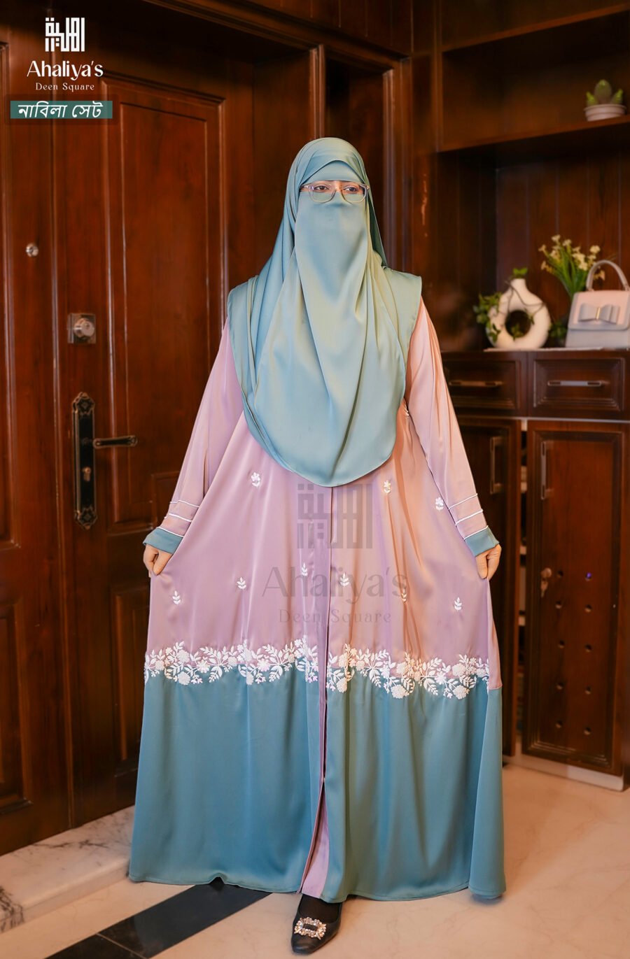 ” নাবিলা সেট ” জাফরান কাপড়ের উপর কারচুপির কাজ করা অনন্য একটি আবায়া । অসাধারণ কালার কম্বিনেশনের উপর ইউনিক কারচুপির কাজে মোলায়েম স্পর্শ রয়েছে । পুরো সেটটি জুড়ে ছড়িয়ে রয়েছে মির্মলতার নিখুঁত প্রকাশ