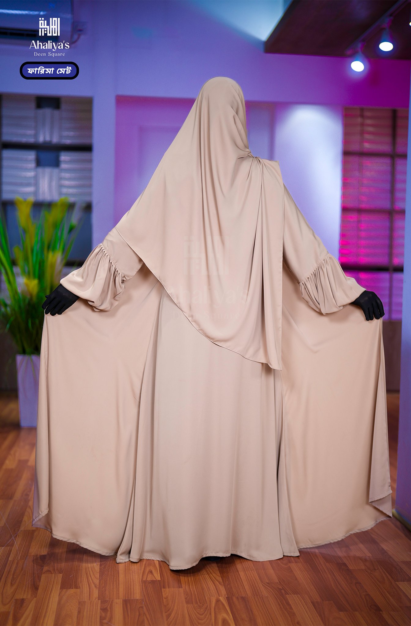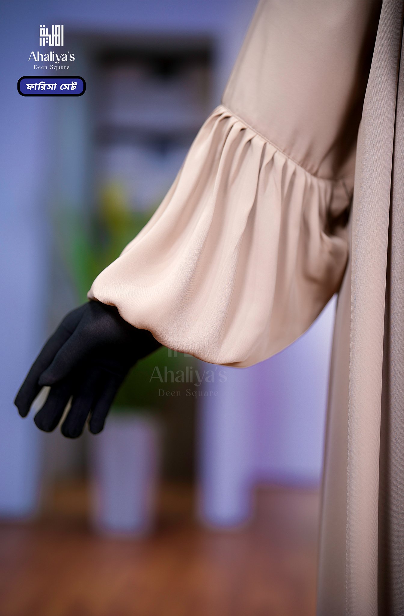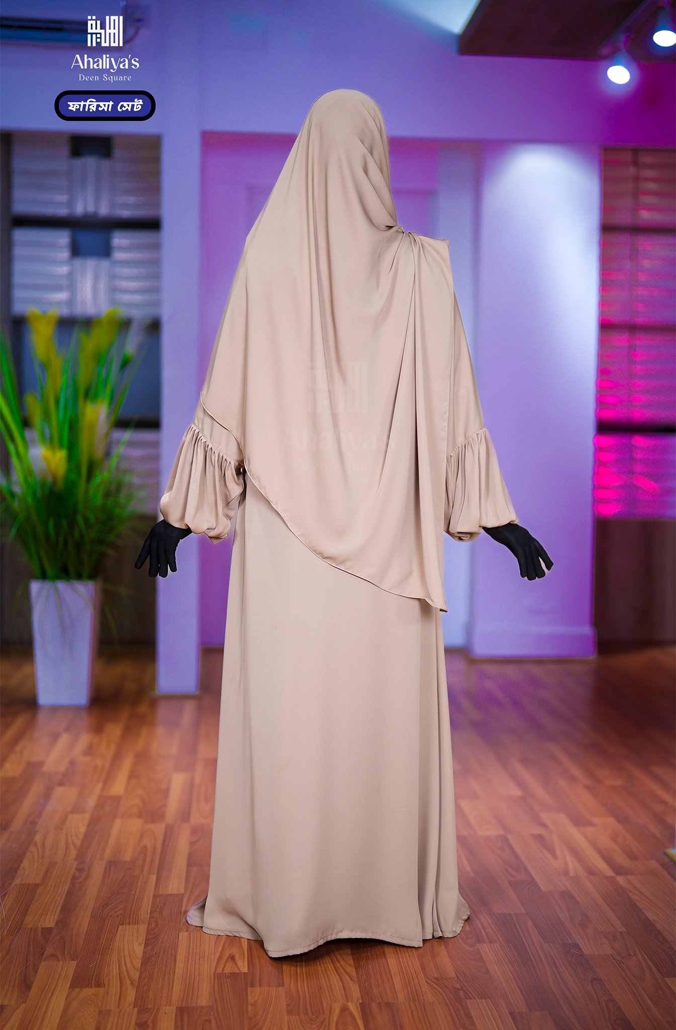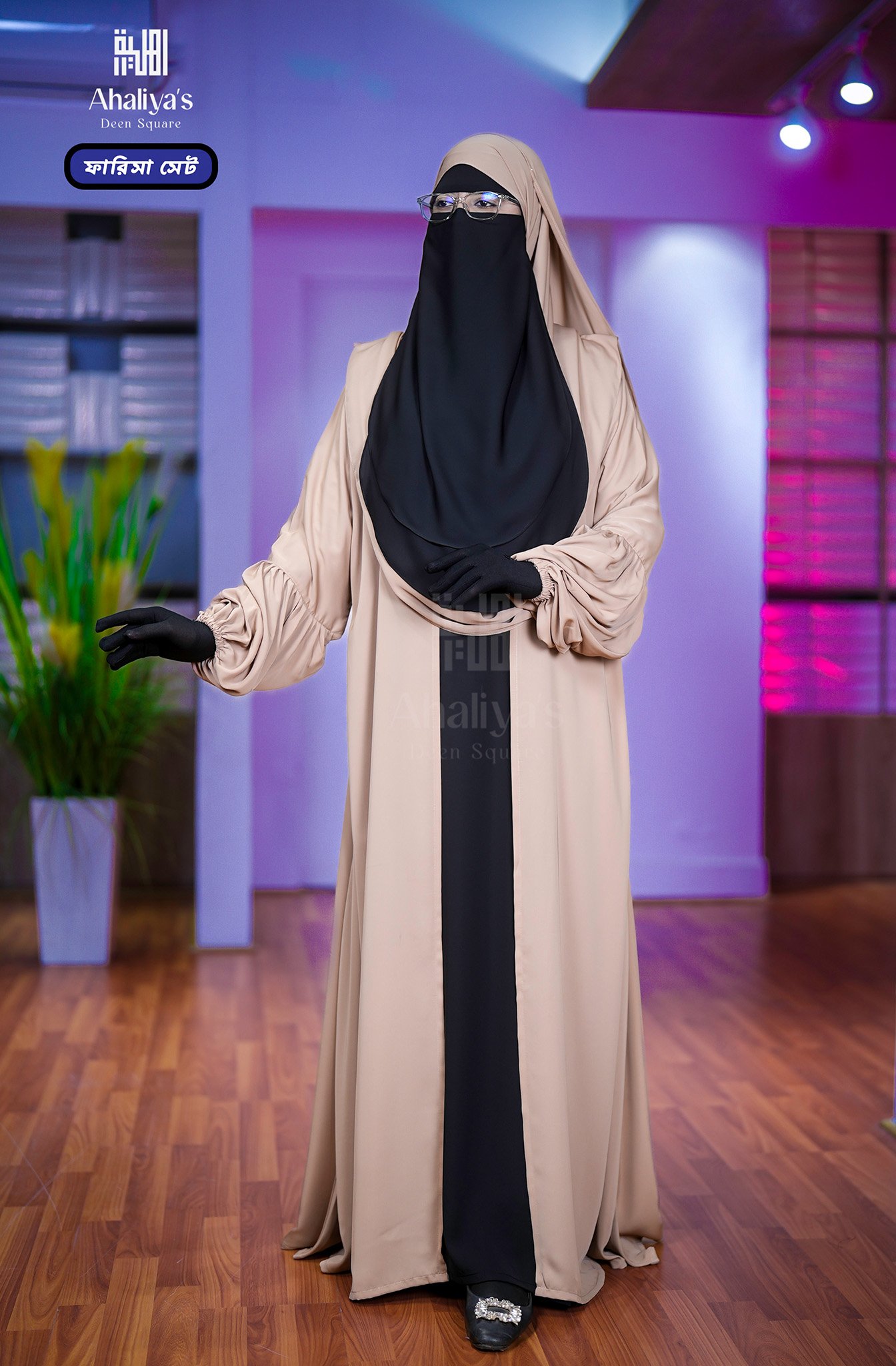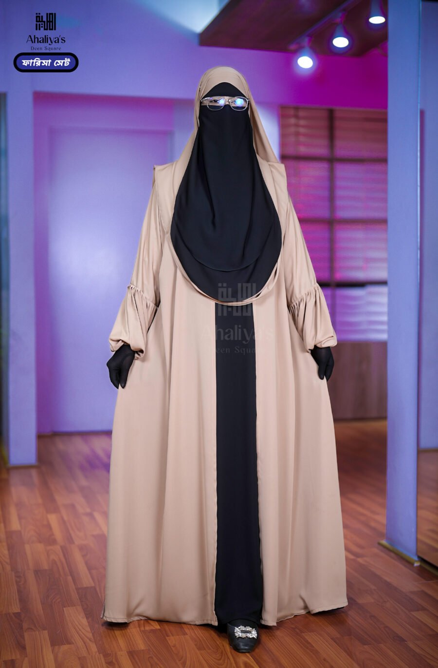 সেটটির বিশেষত্ব হলো এর হাতার ডিজাইন, হাতার কুচি ডিজাইনটি সেটটিকে দিয়েছে নতুনত্ব। এছাড়াও সেটটির কালার কম্বিনেশনও চমৎকার। সেটটির সাথে পেয়ে যাচ্ছেন প্লেইন ওড়না হিজাব ও সিঙ্গেল লেয়ার নিকাব।