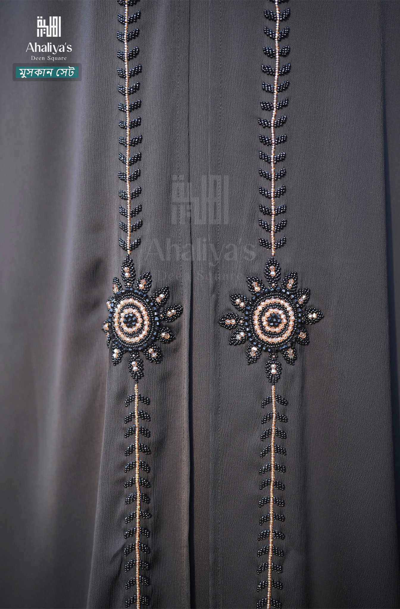 ব্লাকের উপর ব্লাক কালার কাজের মধ্যে থাকে অসাধারণ মুগ্ধতা। “মুসকান” সেটে এমনই এক প্যাটানের সাথে রয়েছে হালকা হোয়াইটের টাস, যা এই সেটটিকে করে তুলেছে মনোমুগ্ধকর। অ্যাটাস্ট কটি স্টাইলের সেটটির ডিজাইন আপনাকে যেমন মুগ্ধ করবে, তেমনি আপনাকে দিবে এ্যালিগেন্ট লুক।