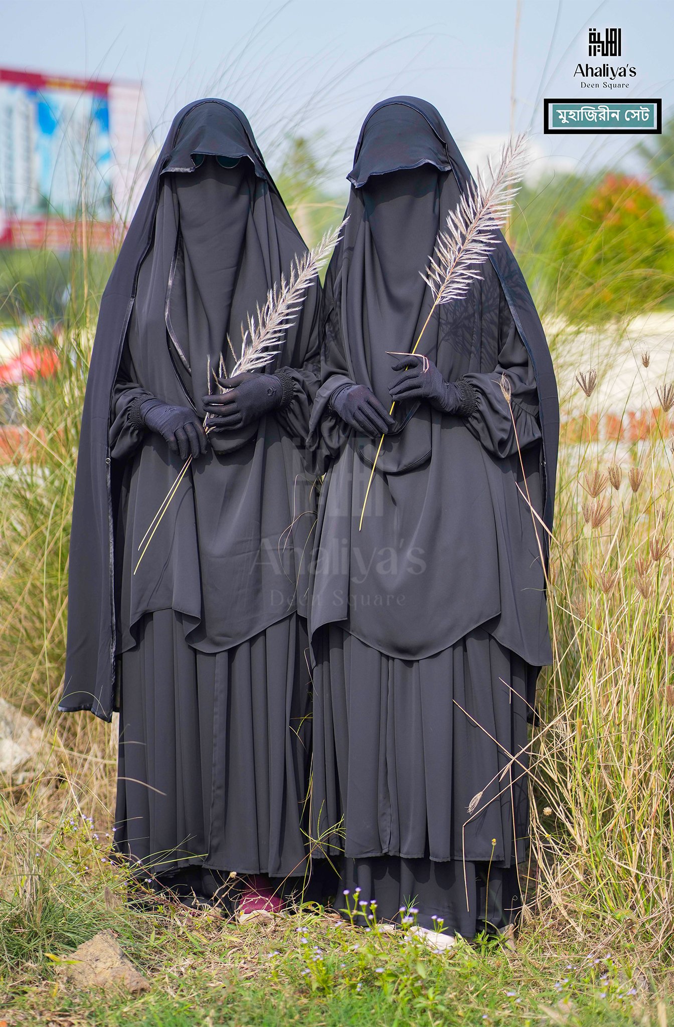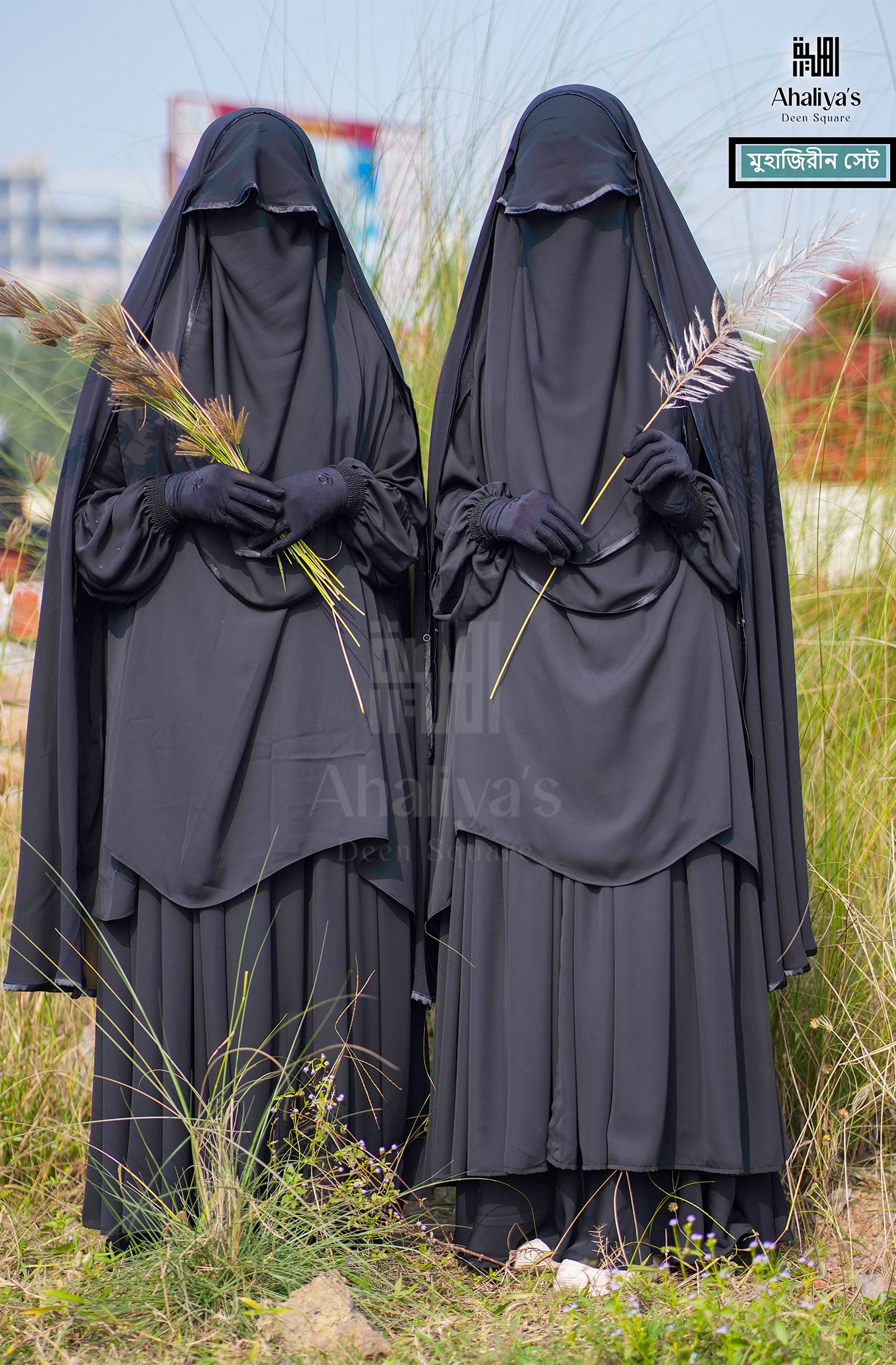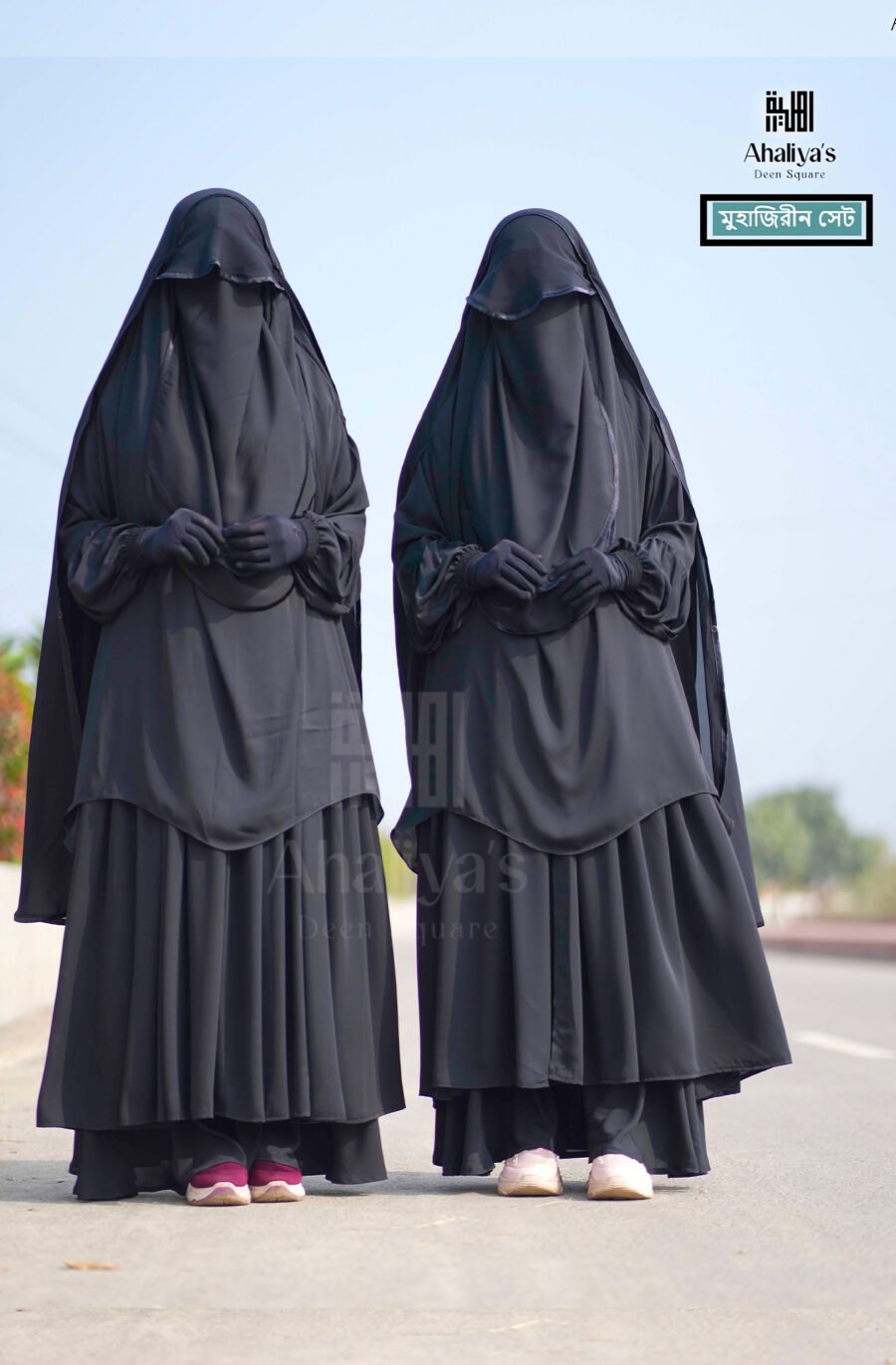 মুহাজিরীন-সেট স্লিভলেস জিলবাবের পেছনে অনেক লং, যেটা হাইট অনুযায়ী বানানো হবে। এর উপরে আলাদা একটি পার্ট এমনভাবে লাগানো হয়েছে যা কপাল এবং কাধে একদম ফিক্সড থাকবে।