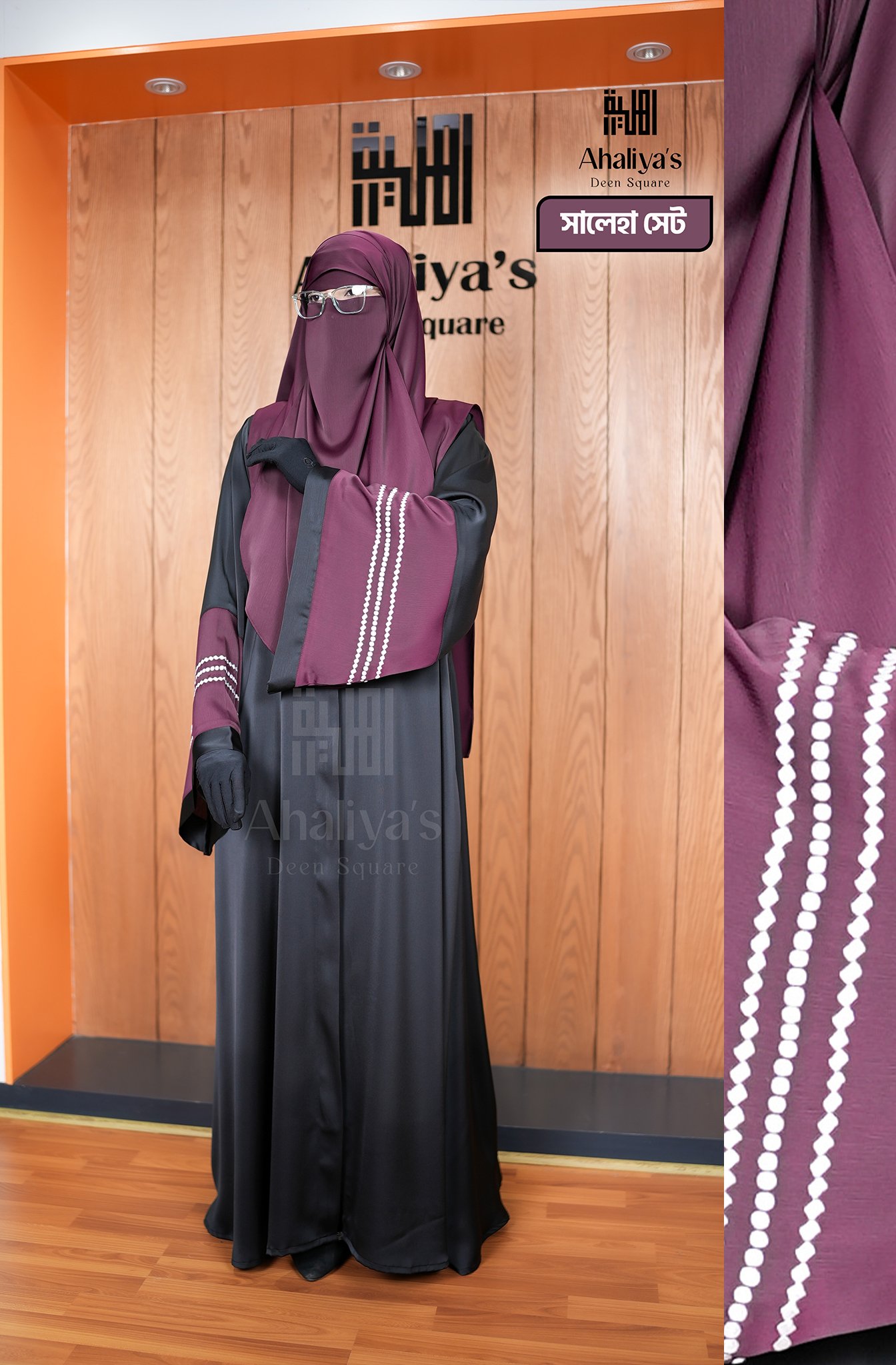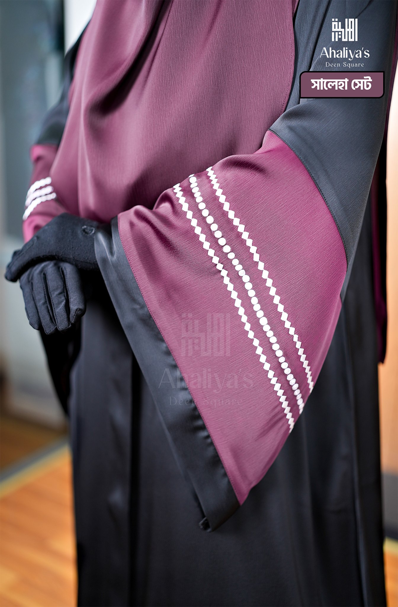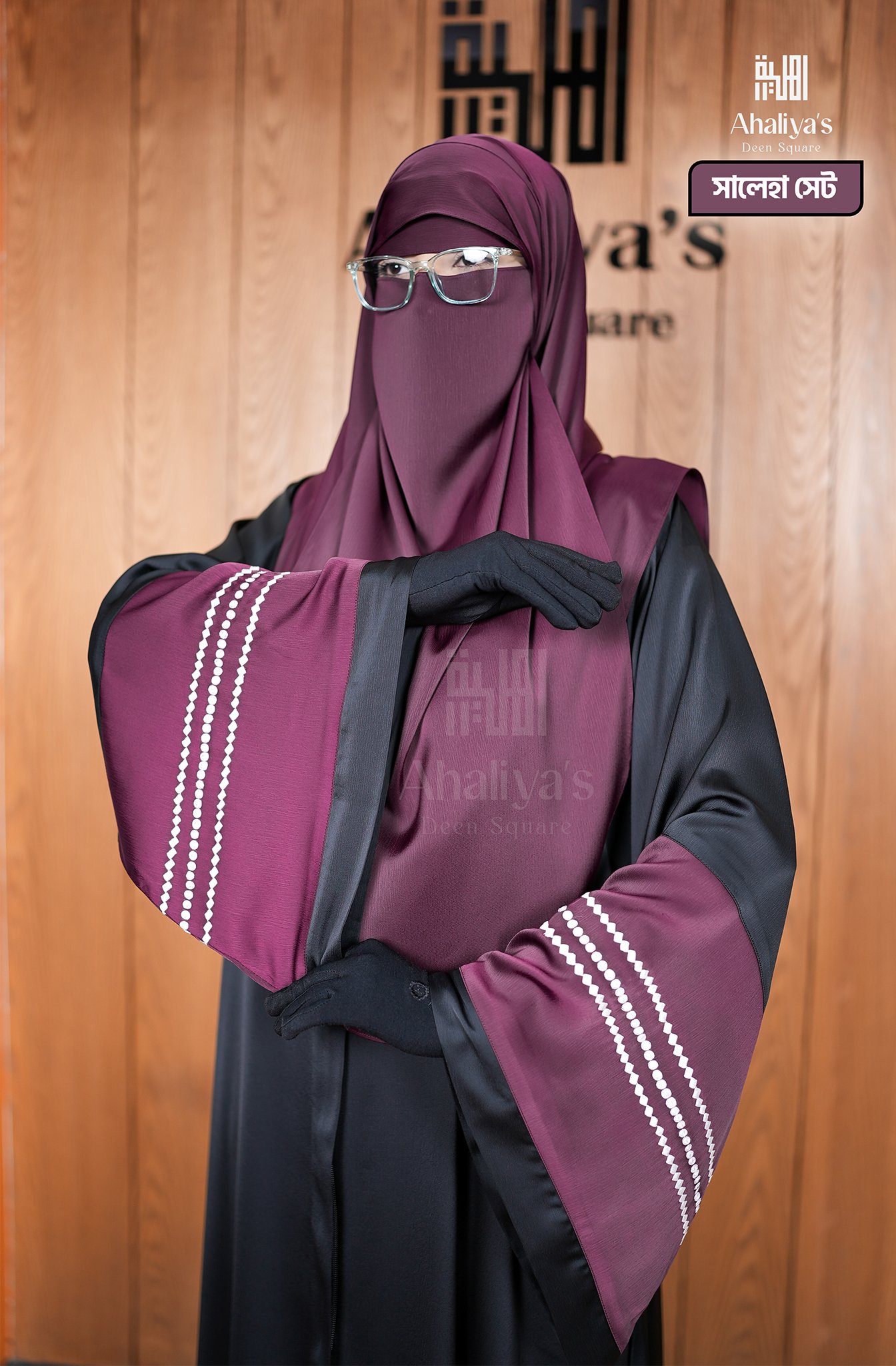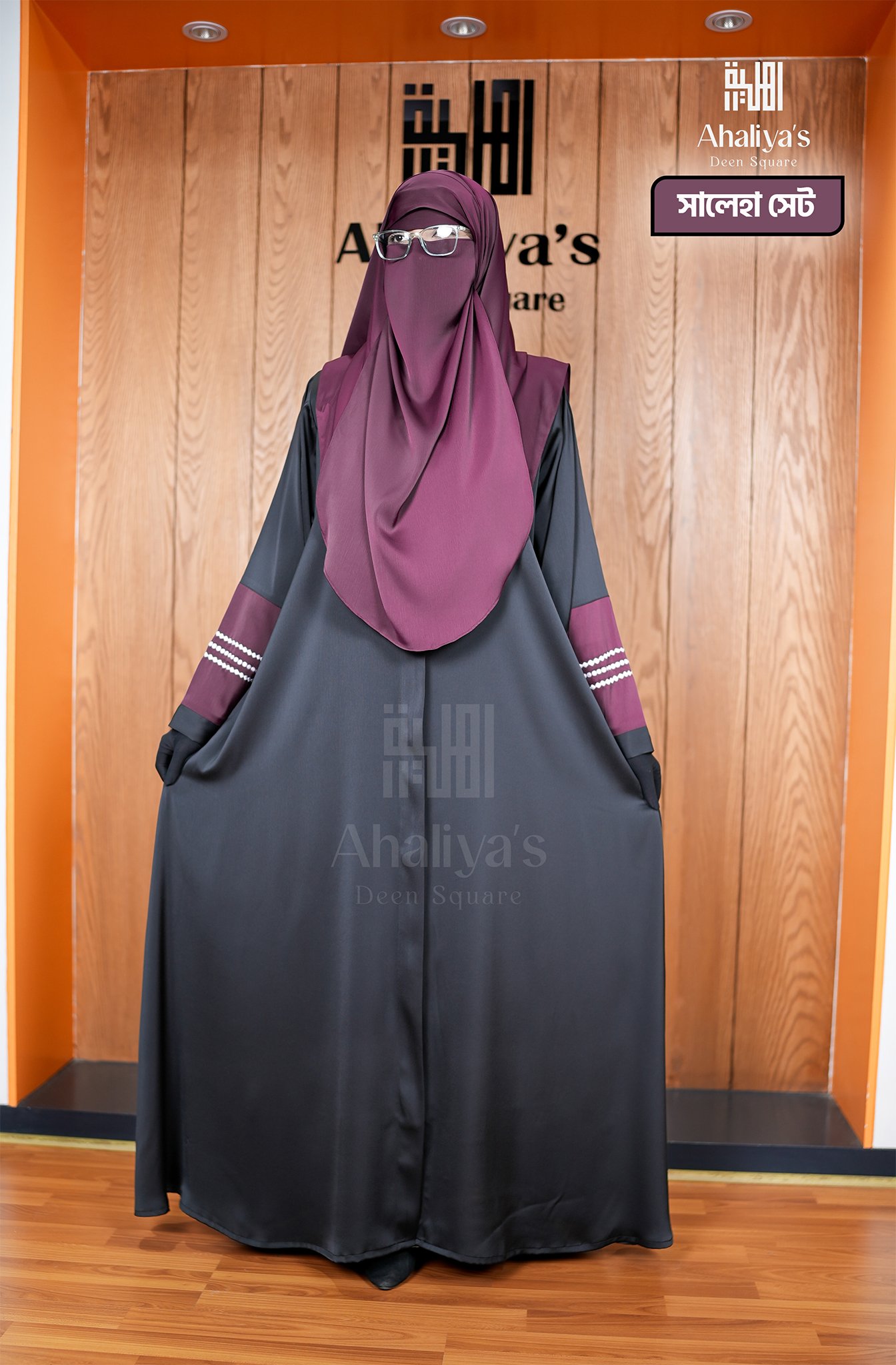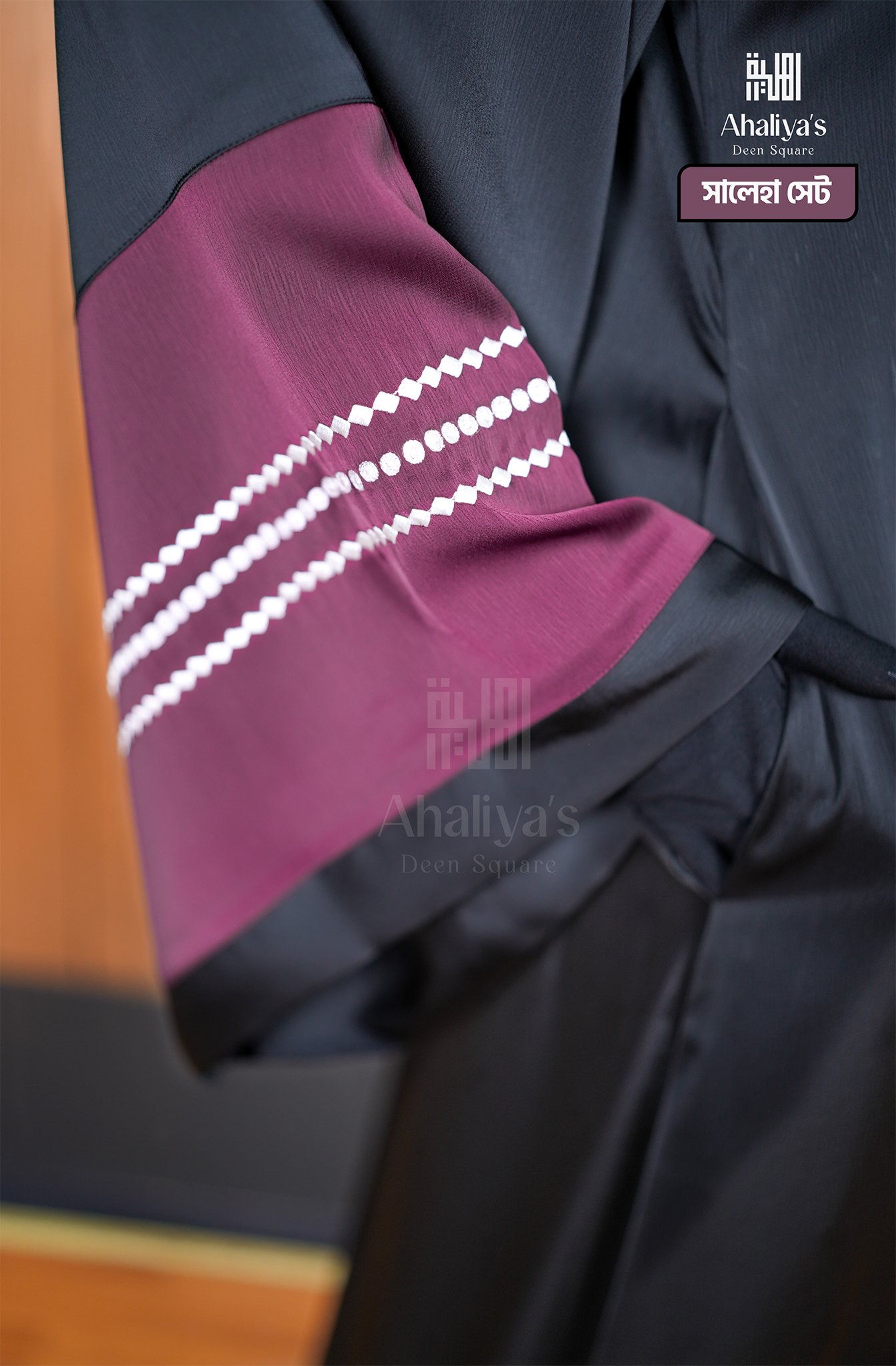 “সালেহা সেট” এক পার্টের একটি সেট, গরমে স্বস্তি দেয়ার মতো একটি আবায়া। এটি মিনিমাল ডিজাইনের আবায়া হওয়ার পরও, এর কালো ও মেরুন কালার কম্বিনেশন এবং হাতায় প্রিমিয়াম কোয়ালিটির এমব্রয়ডারি ডিজাইন এতে দিয়েছে নতুনত্বের ছোঁয়া। কম্ফোর্টেবল লুজ ফিটিংস হাতার সাথে, আবায়ার সামনের পার্টে গলা থেকে পা পর্যন্ত চেইন সিস্টেম থাকার কারণে এটা আরও বেশি কম্ফোর্টেবল হয়ে উঠেছে।এছাড়াও সামনে চেইন থাকার কারণে এটি প্রেগনেন্ট আপু এবং নিউবর্ণ বেবির মায়েদের জন্য নতুন একটি সংযোজন। এর সাথে রয়েছে প্লেন ওড়না ও সিঙ্গেল লেয়ার নিকাব।