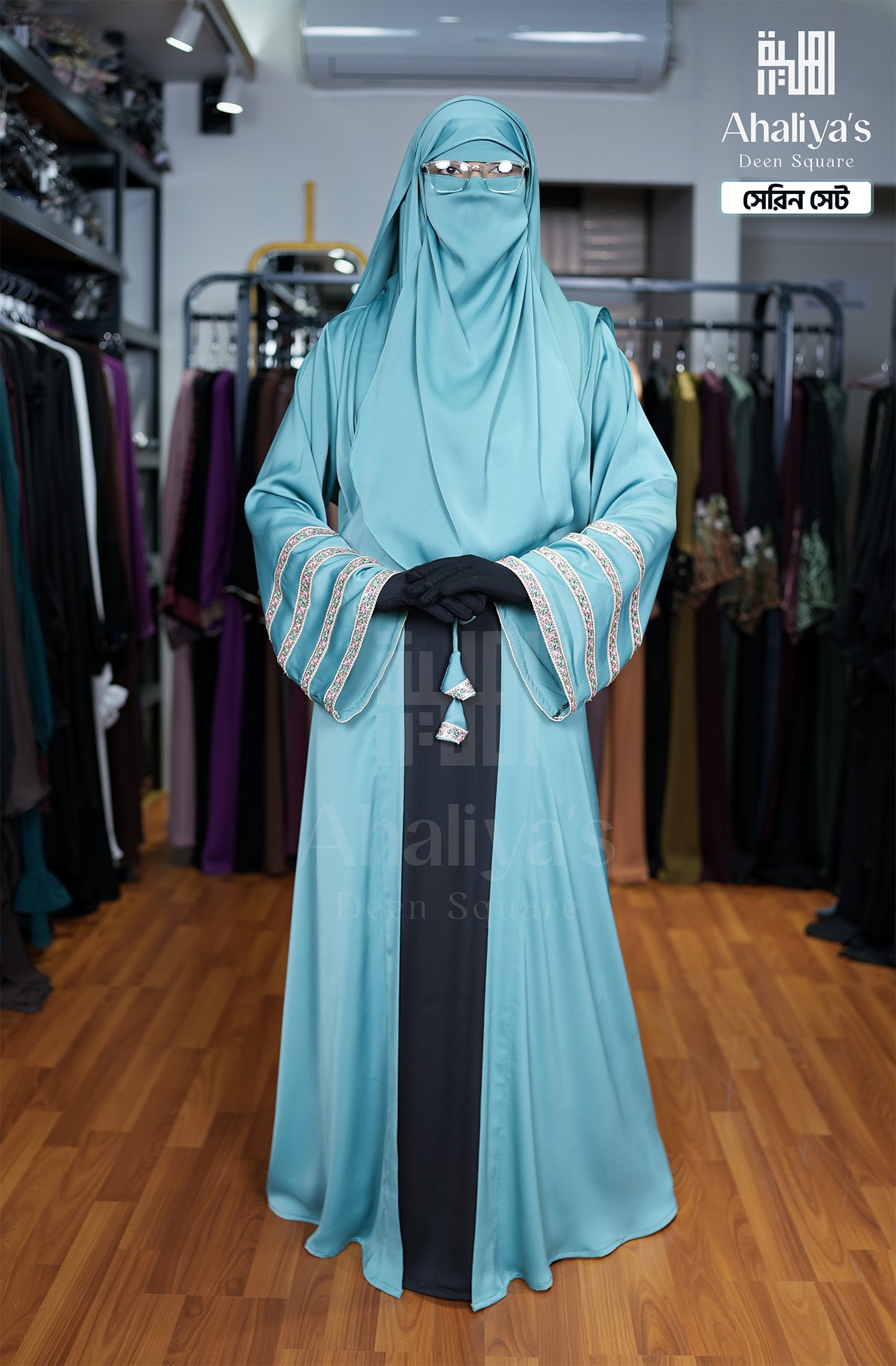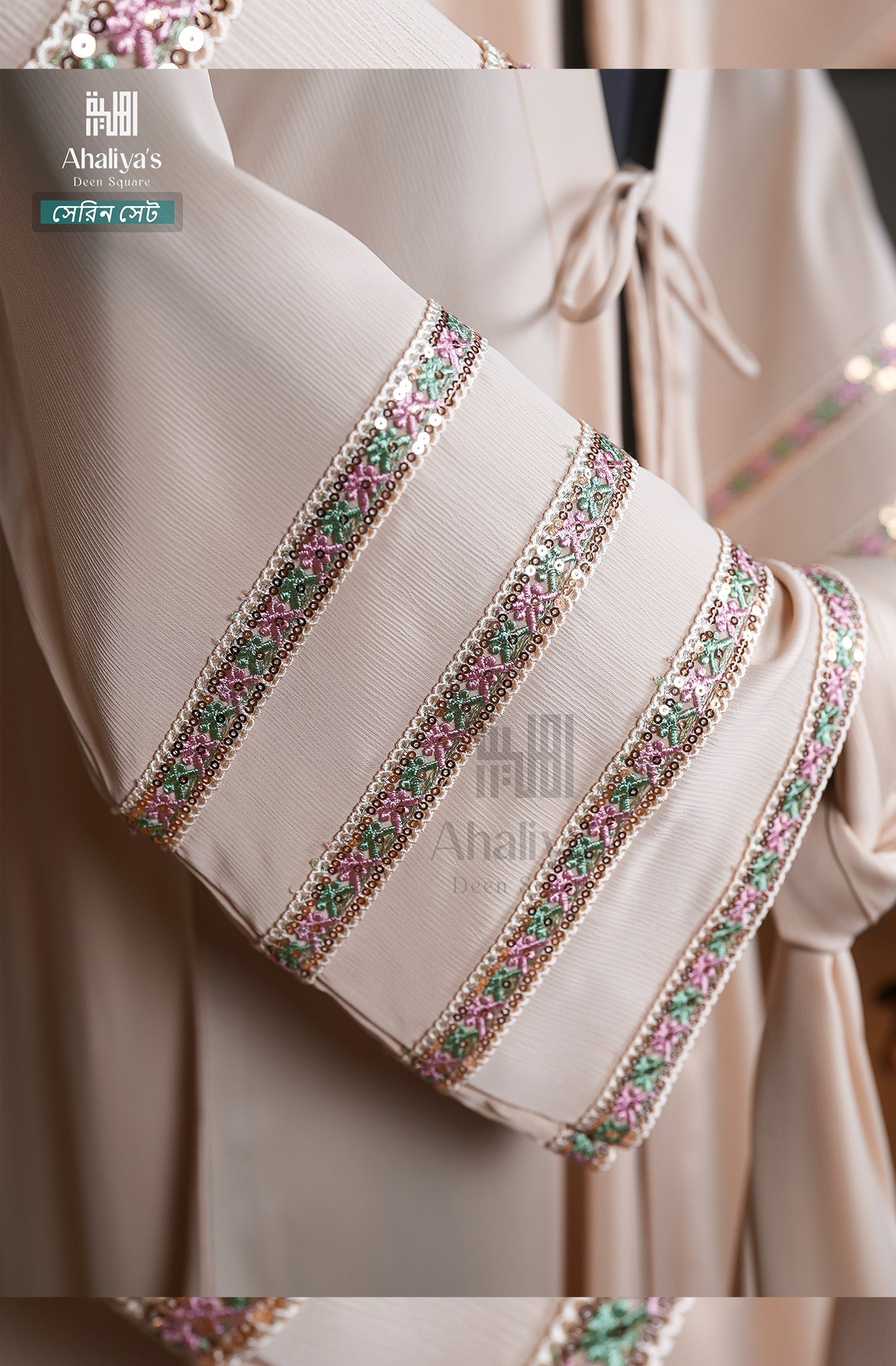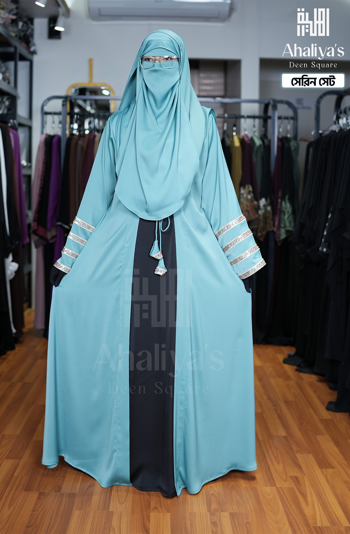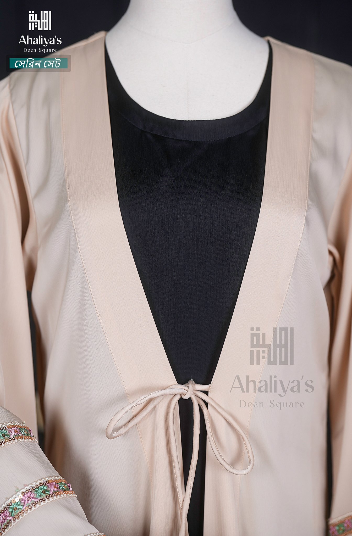 “সেরিন সেট” কটি সিস্টেম আবায়ার সংযোজন। এর এটাস কটির সাথে ফিতায় লাগানো টারসেলের ডিজাইন ও হাতায় থাকা প্রিমিয়াম কোয়ালিটির সিকুয়েন্স এবং মাল্টি কালার সুতোর লেইস ওয়ার্ক একে একটি সফিস্টিকেটেড লুক দিয়েছে।পেস্ট ও ব্লাক কালার কম্বিনেশনে এটি হয়ে উঠেছে কোমল। এছাড়াও এই সেটের সাথে রয়েছে প্লেন ওড়না এবং ওয়ান পার্ট নিকাব।
